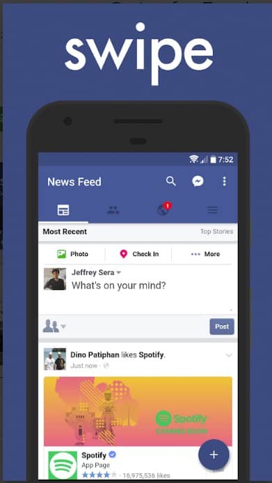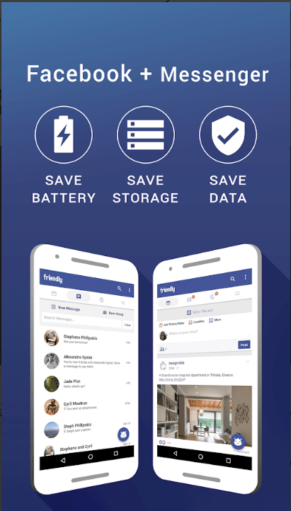 يجمع هذا التطبيق بين فيس بوك وماسنجر في تطبيق واحد فلا داعي للتنقل بين تطبيقين ما بين التصفح والكتابة من خلال ميزة Chat bubbles بالإضافة إلي توفير عمر البطارية حيث إنه يقوم باستهلاك أقل لموارد الجهاز من التطبيق الأساسي وأيضاً إلي كونه يستهلك اقل من باقة الإنترنت الخاصة بك فهو من أفضل التطبيقات البديلة المثالية .