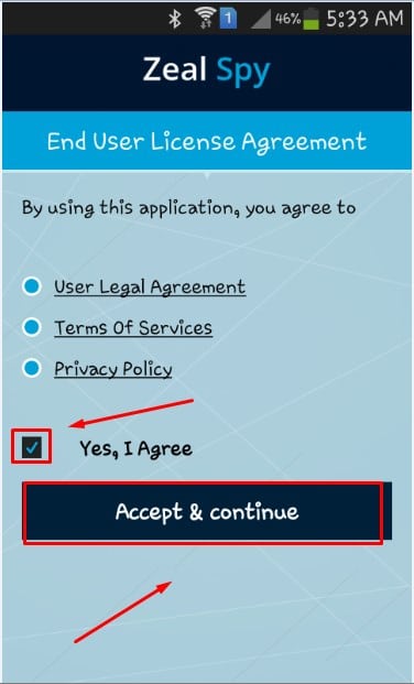 ثانياً : قم بتثبيت التطبيق على هاتف الضحية التي تريد أن تخترقها ، وقم بفتحه وستظهر لك شاشة التطبيق الرئيسية كما في تلك الصورة فقط قم بالموافقة على شروط التطبيق من خلال الضغط على Accept & Continue كما هو موضح لك :