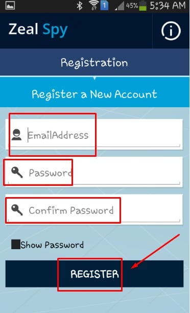 ثالثاً : والآن قم بإدخال عنوان البريد الإلكتروني الذي سيصل إليك من خلالة جميع نشاطات والبيانات الخاصة بهذا الهاتف المُخترق، وكلمة المرور التي ستمنع صاحب الهاتف من أيقاف تشغيل التطبيق .