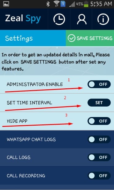 رابعاً : بعد الانتهاء من الخطوة السابقة قم الآن بتشغيل التطبيق من خلال السهم الأول وضبط وقت إرسال البيانات إلي البريد الإلكتروني الخاص بك من السهم الثاني وتستطيع أيضاً أن تقوم بعملية إخفاء التطبيق على هاتف الضحية من خلال السهم الثالث .