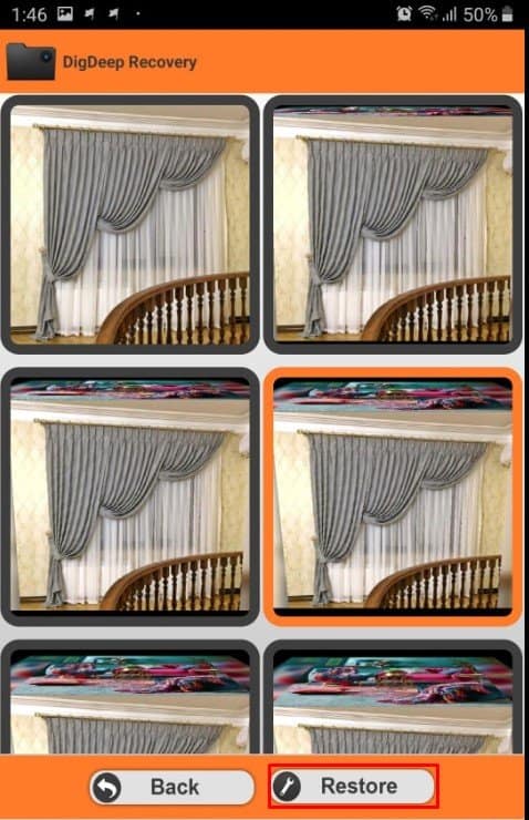 - عند انتهاء البرنامج من عملية الاسترجاع يمكنك تخزين الصور على هاتفك وذلك من خلال الضغط على الصور المُراد تخزينها ثم الضغط على Restore .