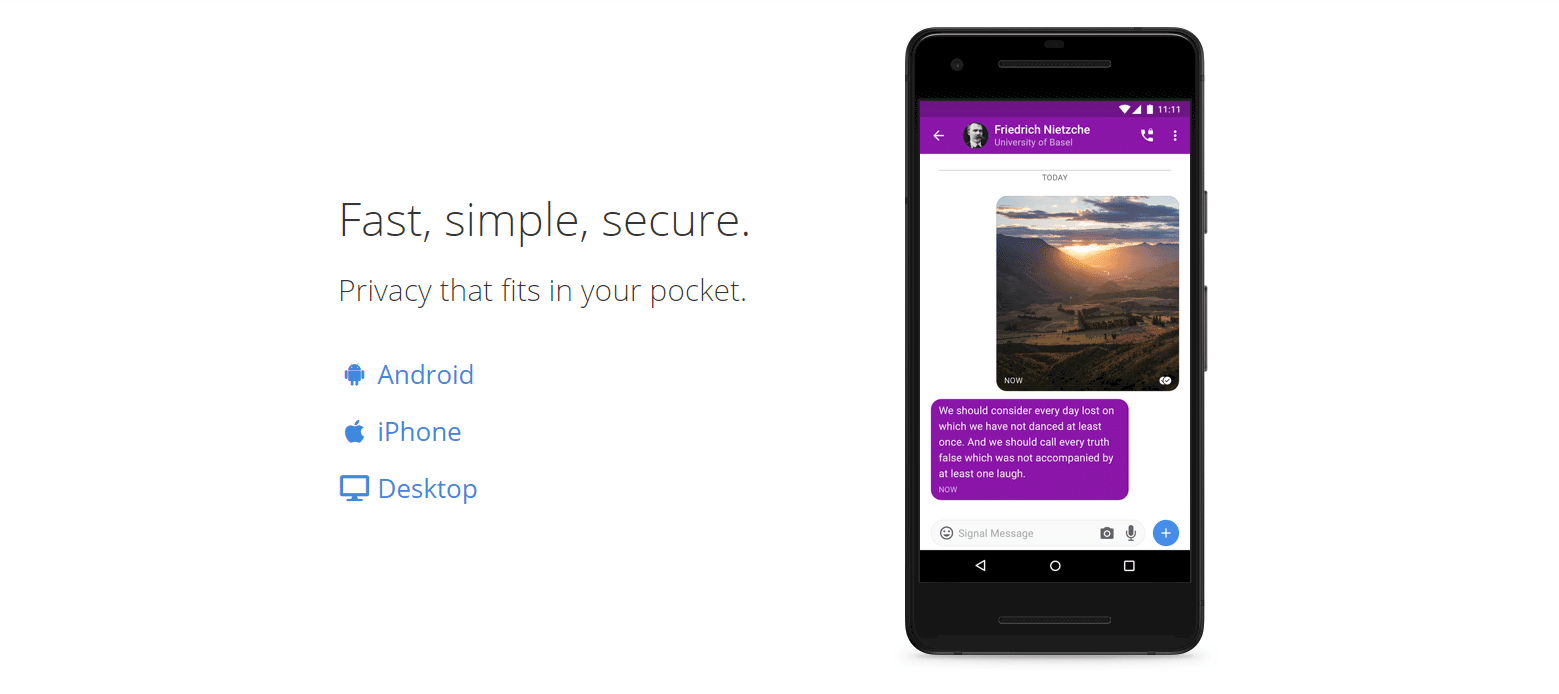 يحتوي تطبيق Signal علي تشفير قوي وهو من التطبيقات الممتازة وأيضاً يعمل بشكل مجاني بالإضافة أنه يعمل علي جميع أنظمة تشغيل الهواتف الذكية وتكون جميع الرسائل عليه مشفرة فلا يمكن للمتسللين قراءة الرسائل علي الإطلاق فتطبيق Signal يستخدم تشفير مفتوح المصدر وأيضاً يتضمن ملفات تثبيت علي سطح المكتب لتتمكن من استخدام التطبيق علي جهاز الكمبيوتر الخاص بك بمنتهي السهولة ويحتوي علي العديد من مزايا الخصوصية والأمان بشكل قوي جداً .