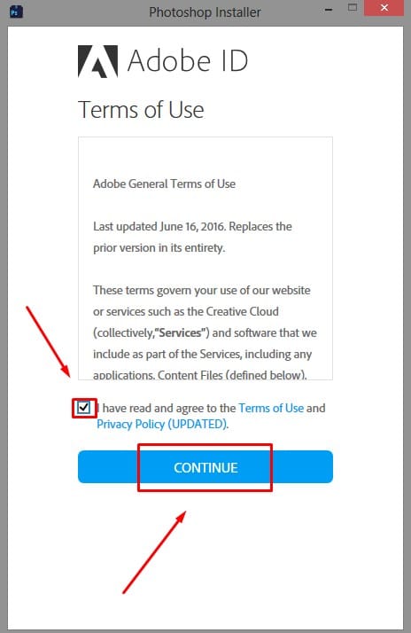 خامساً : ضع علامة صح أمام الشروط والأحكام الخاصة ببرنامج فوتوشوب CC 2020 ثم اضغط على كلمة Continue .