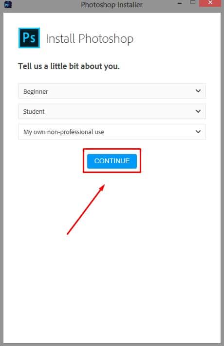 سادساً : قم بالإجابة عن هذا الاستطلاع الذي تقوم به شركة Adobe للتعرف على مستخدمين برنامج فوتوشوب CC 2020 ثم اضغط على Continue .