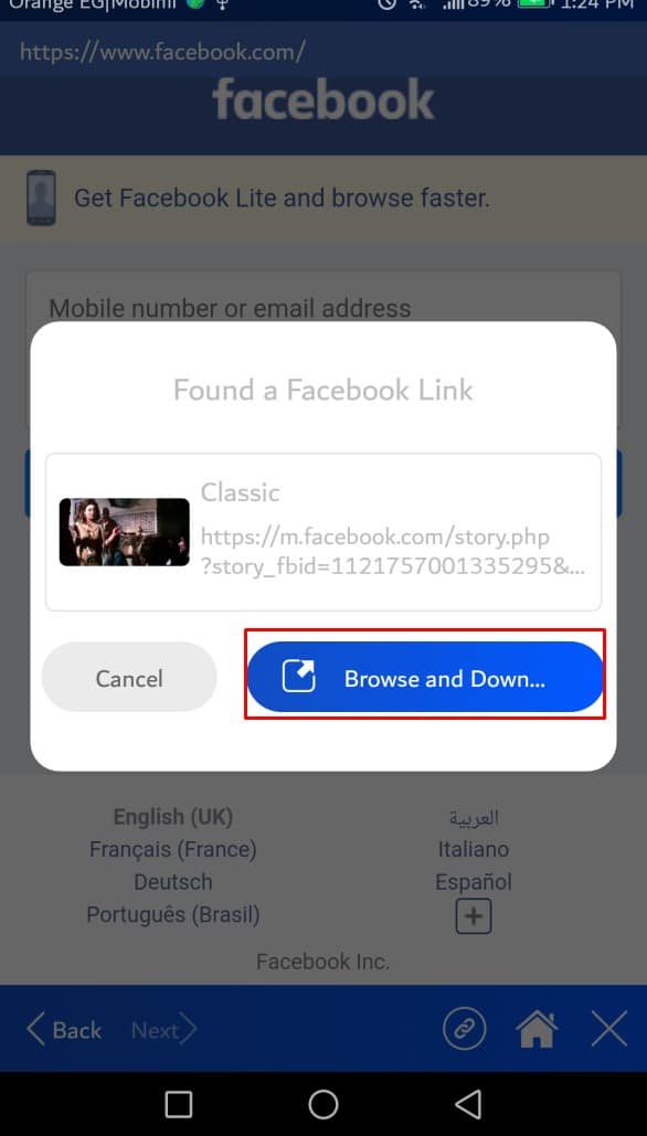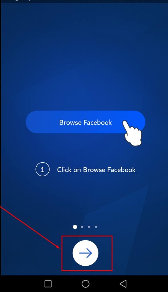 4- ثم بعد ذلك أضغط علي Browse Facebook لتسجيل دخول فيسبوك من خلال التطبيق كما في الصورة التالية :