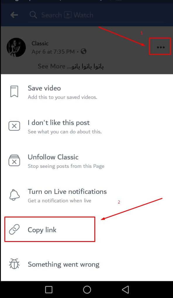 5- قم بالتصفح على فيسبوك وإذا وجدت فيديو تريد أن تقوم بتحميله أضغط علي علامة الثلاث نقاط الموجودة أعلي المنشور ثم اضغط علي Copy link الموجودة ضمن الخيارات :