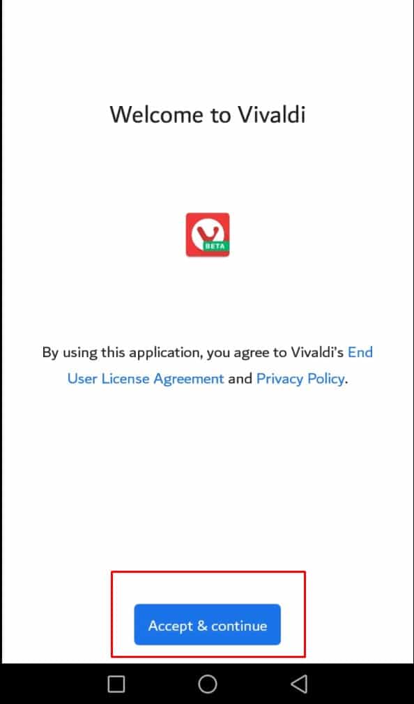 أولاً : قم بفتح المتصفح على هاتفك وستظهر لك واجهة ترحيبية بعد التثبيت مباشراً كما هي موجودة أمامنا في الصورة التالية فأضغط على Accept & Continue للموافقة على شروط الأحكام والاستخدام :