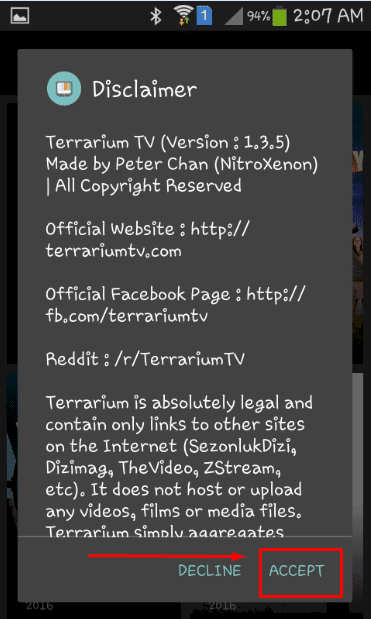 بعد ذلك قم بالضغط على Accept كما هو موضح للموافقه على شروط استخدام التطبيق :