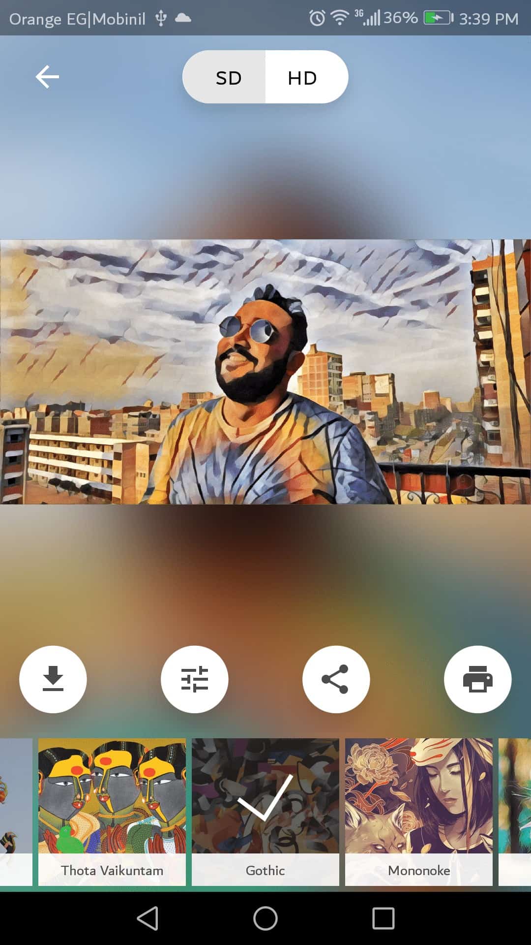 ثالثاً : بعد الاستقرار علي قالب من القوالب المُقدمة من تطبيق Prisma Photo Editor يمكنك حفظ الصورة علي هاتفك أو مشاركتها من خلال مواقع التواصل الاجتماعي :