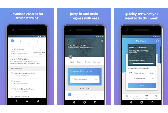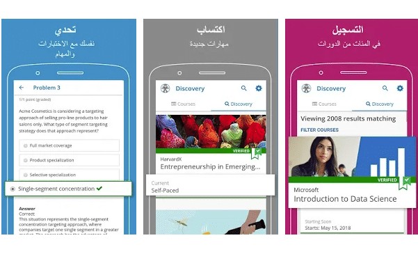 دورات متنوعة علي الإنترنت لتعليم اللغات والعلوم وغيرها من التخصصات المتنوعة ( علوم الكمبيوتر و الأعمال والإدارة والرياضيات وغيرها ) من أفضل الجامعات والكليات ومعاهد التدريب على مستوى العالم لتستخدمها على الأجهزة الهواتف الذكية لديك حتى تتمكن من تعلم مهارات جديدة في أي وقت وأي مكان .
