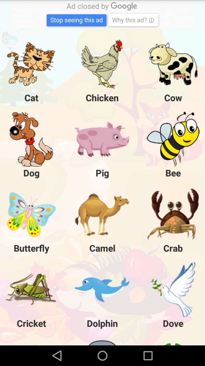 ثانياً : قم باختيار ما تريد فإذا بدأت بأول اختيار وقمت بالضغط علي Start ستجد الكثير من الأقسام من أرقام وحروف وحيوانات وألوان فعند اختيار أي قسم تجد داخلة الكثير من الكلمات بالصور التوضيحية لها .