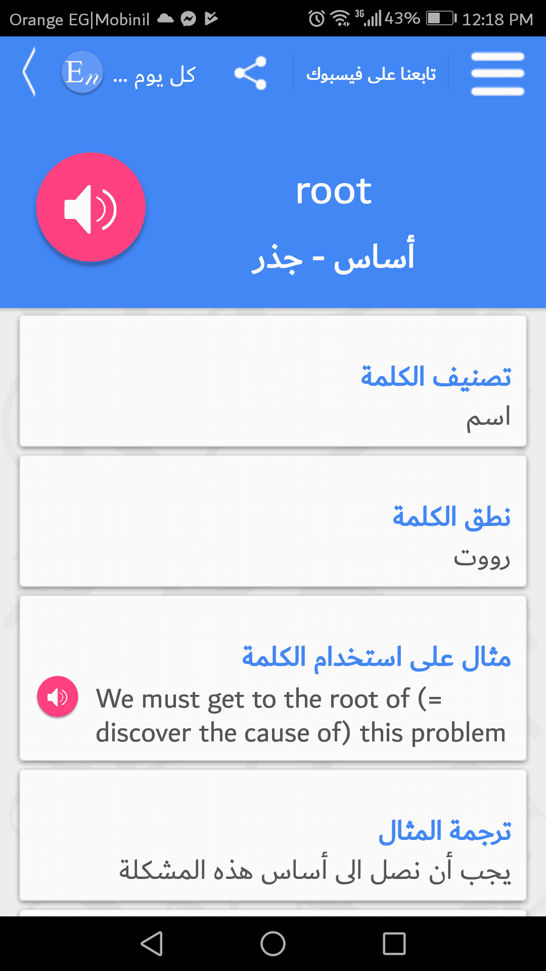رابعاً : عند النقر علي أي كلمة من الكلمات المعروضة في التطبيق ستنتقل بك الصفحة إلي صفحة أخري بها وصف تفصيلي عن الكلمة ( تصنيف الكلمة – نطق الكلمة – مثال علي استخدام الكلمة – ترجمة المثال – ملاحظة إضافية ) وأيضاً يمكنك استخدام إعدادات التطبيق المختلفة حيث يمتلك مجموعة من المهام المهمة ستساعدك بالتأكيد كما هو موجود في الصورة الثانية :