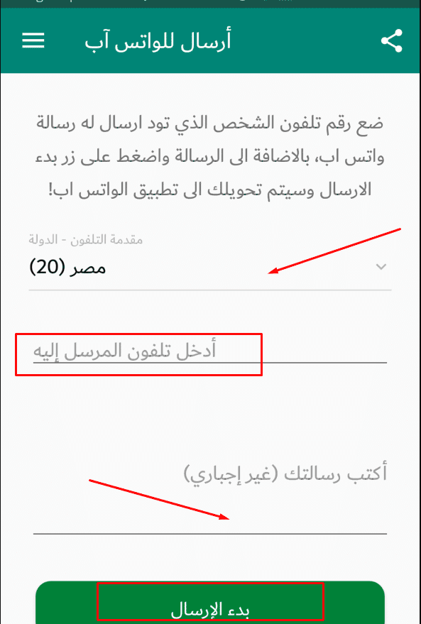 الخطوة الثالثة : حدد البلد ثم أدخل رقم هاتف المرسل إليه ثم أكتب رسالتك ثم أضغط علي ” بدء الإرسال ” كما هو مُشار إليه في الصورة التالية :