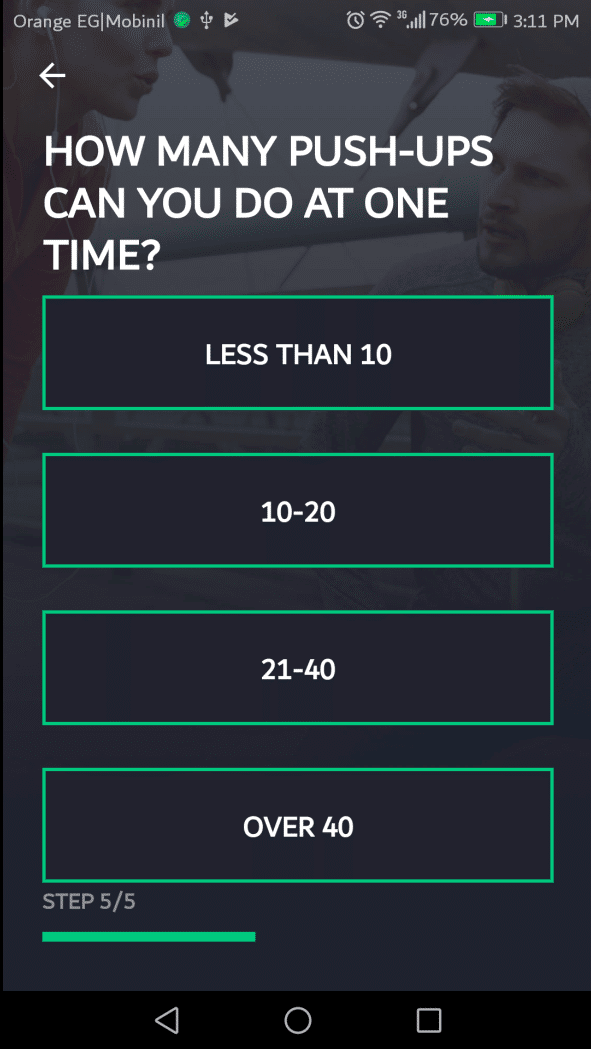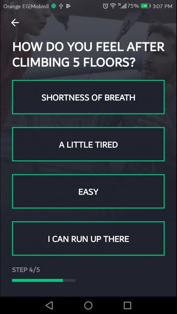 رابعاً : ثم سيسألك التطبيق عن حالتك أثناء ممارسة التمارين فهل تعاني من ( ضيق في التنفس – متعب قليلاً – بحالة عادية – يمكنك الركض ) فقم باختيار ما يناسبك :