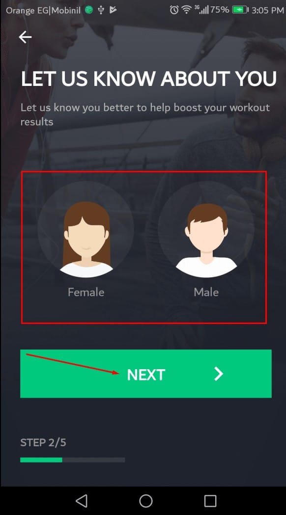 ثانياً : سيطلب منك التطبيق أن تختار التمارين الرياضية المناسبة سواء كانت هذه التمارين للذكور أو للإناث كما هو موجود في الصور التالية :