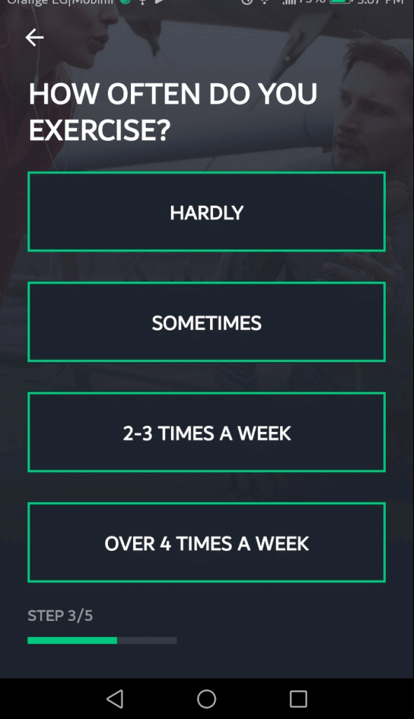 ثالثاً : بعد ذلك سيسألك التطبيق عن كيفية ممارسة التمارين فهل تستطيع ممارسة التمارين ( بصعوبة – في بعض الأحيان – من مرتين إلي ثلاث مرات في الأسبوع – أكثر من أربعة مرات في الأسبوع ) فقم باختيار ما يناسبك :