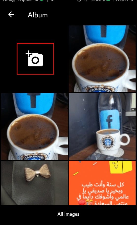 الخطوة الثانية : بعد ذلك قم بالضغط علي علامة الإضافة ( + ) لاختيار صورة من الصورة الموجودة علي الهاتف أو لتصوير صورة جديدة كما هو موجود في الصورة التي هي أمامنا :