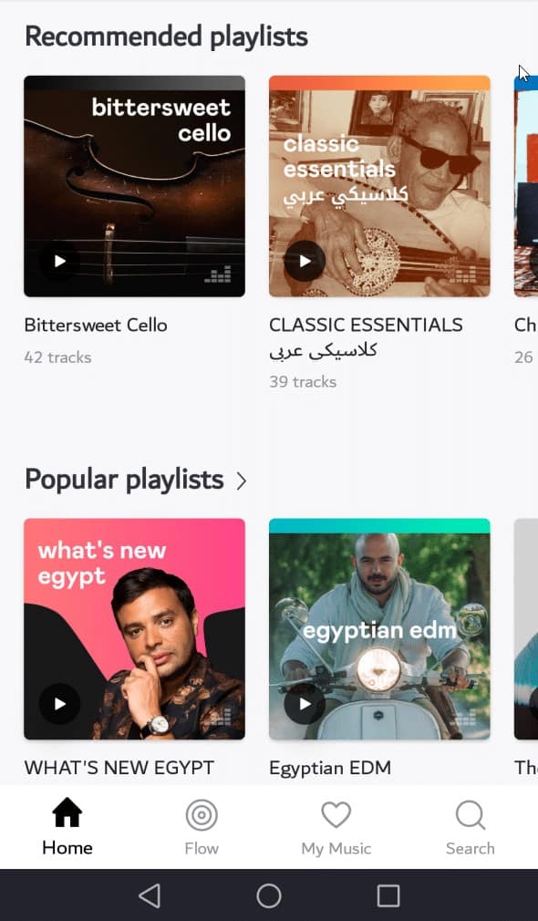 وبعد ذلك ستظهر واجهة التطبيق الرئيسية بأنواع الموسيقي والأغاني التي قمت باختيارها مع مجموعة من قوائم التشغيل الخاصة بالتطبيق تحمل نفس نوع الأغاني والموسيقي المختارة .