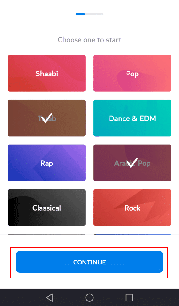 الخطوة الخامسة : ثم بعد ذلك يطلب منك التطبيق اختيار أنواع الموسيقي التي تحب سماعها فقم بالنقر علي الأنواع المناسبة لك كما في الصورة التالية : مميزات تطبيق الموسيقي Deezerتطبيق لجميع أنواع الموسيقي المحلية والعالمية من كل دول العالم
