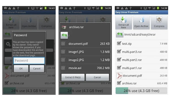 يمكنك استخدام Easy Unrar بكل سهولة فهو تطبيق مجاني ويعمل علي الهواتف الاندرويد ويسمح لك بعملية فك ضغط الملفات أو ضغطها وأيضاً حفظها في الأرشيف بصيغة RAR بمنتهي البساطة بالإضافة إلي أنه يدعم جميع إصدارات الملفات التي تكون بصيغة RAR وسيساعدك هذا التطبيق أيضاً بالعمل على تخطى مشكلة فك الملفات المضغوطة الأرشيفية المحمية بكلمة سر والملفات الأرشيفية التي تتكون من عدة أجزاء أو ملفات مضغوطة وتكون أكثر من جزء ومشفرة بتشفير AES ويمكنك مع تطبيق Easy استعراض الملفات المضغوطة بدون فك الضغط ويمكنك أيضاً توفير الوقت عن طريق تحديد الملفات واستخلص محتوياتها .