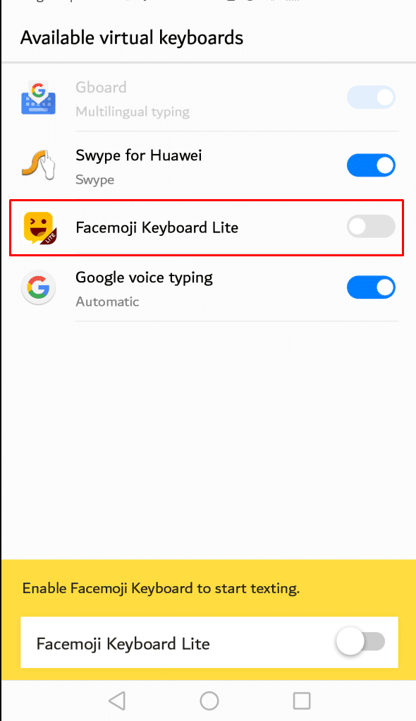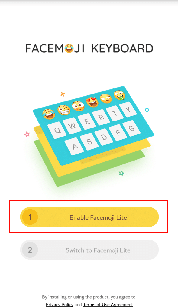 ثالثاً : بعد ذلك سيطلب منك التطبيق التفعيل علي الهاتف بالضغط علي Enable Facemoji Lite كما في الصور التالية :
