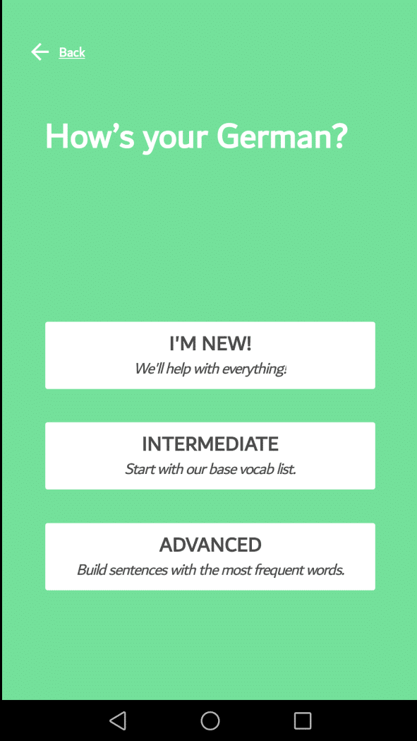 رابعاً : بعد ذلك حدد المستوي الذي تريد أن تبدأ منه ولو كنت أول مرة تتعلم عن طريق التطبيق أضغط علي I’M NEW :