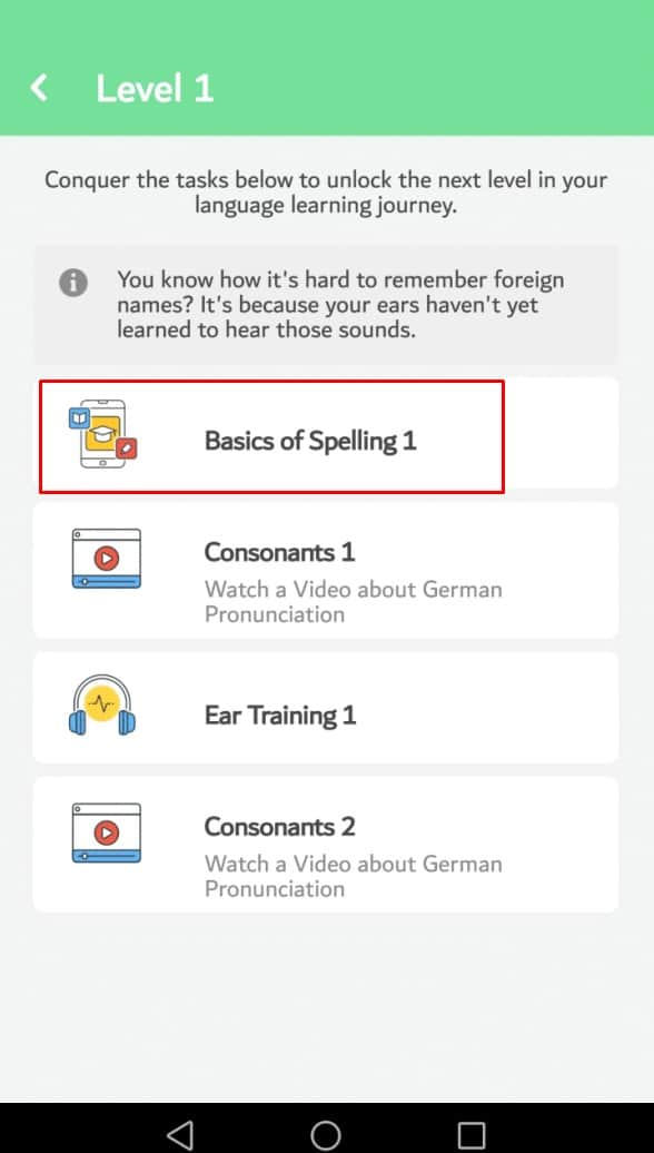 سابعاً : ستجد أول درس في هذا المستوي هو ” Basics of spelling 1 ” ثم الضغط علي Start للبدء :