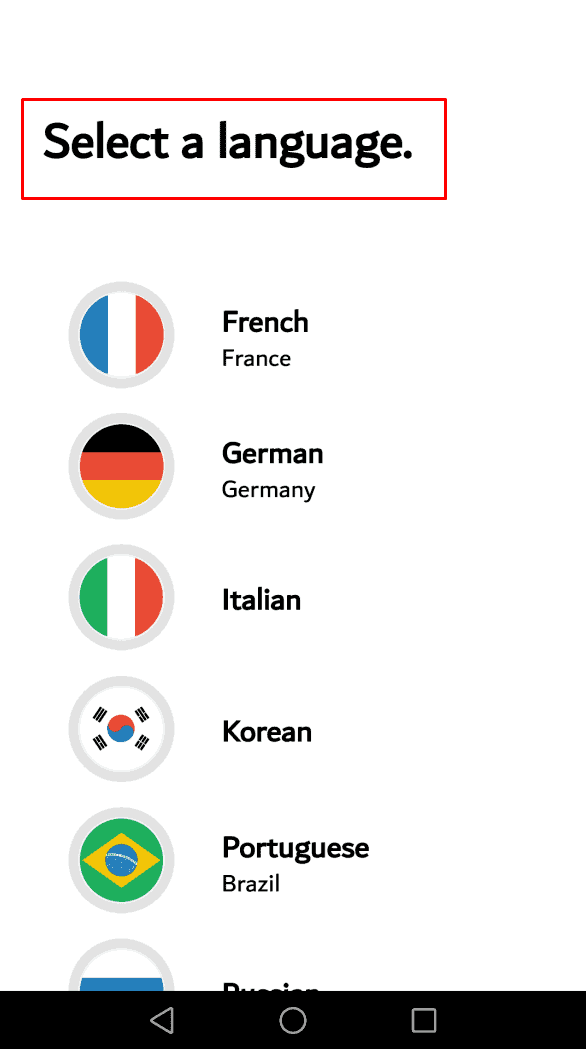 ثالثاً : ثم بعد ذلك يطلب منك التطبيق أختيار اللغة التي تريد أن تتعلمها ( الفرنسية – الألمانية – الإيطالية – الكورية – البرازيلية – الروسية – البرتغالية ) :