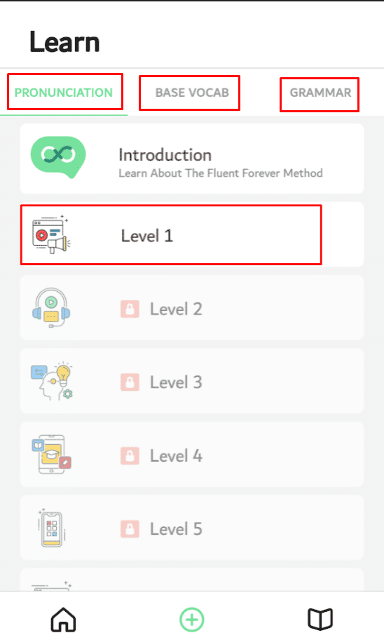 سادساً : ثم تظهر لك واجهة توضح مستويات التعليم بالنسبة للنطق PRONUNCIATION والكلمات الأساسية BASE VOCAB وقواعد اللغة GRAMMER ثم أختر المستوي الأول من النطق كما هو مُشار إليه في الصورة :