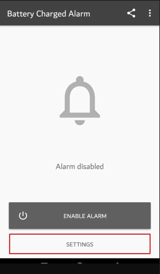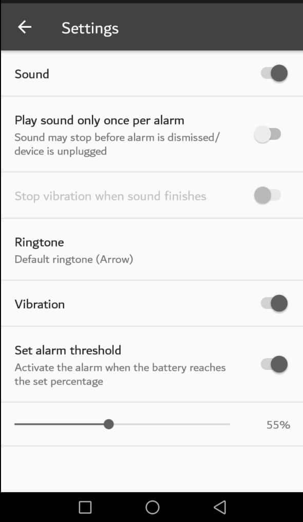 الخطوة الثالثة : سنجد داخل قائمة الضبط Settings أمكانية تفعيل أو تعطيل الصوت واختيار نغمة الرنين و أمكانية تفعيل أو تعطيل خاصية الاهتزاز وتحديد نسبة البطارية التي تريد التطبيق التنبيه عند الوصول إليها كما في الصورة التالية :