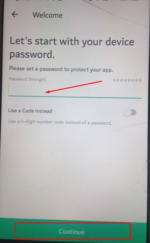 الخطوة الثانية : سيطلب منك التطبيق إنشاء كلمة المرور الخاصة بك عند استخدامك التطبيق ثم أضغط بعد ذلك علي Continue لاستكمال الإجراءات كما هو في الصورة التالية :