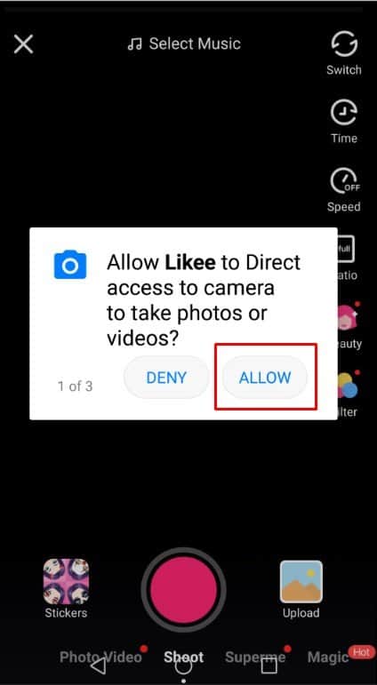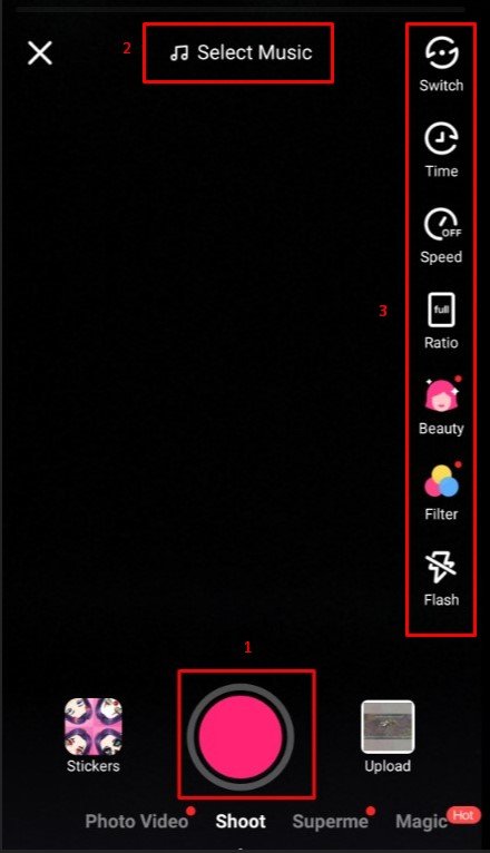 رابعاً : أضغط على العلامة الحمراء لبدء تسجيل الفيديو من خلال كاميرا الهاتف سواء كانت الأمامية أو الخلفية ويمكنك وضع موسيقي أو أغنية كخلفية للفيديو من خلال الضغط على Select Music كما يمكنك استخدام الأدوات الموجودة في جانب الشاشة ( التحكم في الوقت – سرعة الفيديو – التحكم في حجم أبعاد الفيديو – أوضاع التجميل – الفلاتر – التحكم في الفلاش ) :