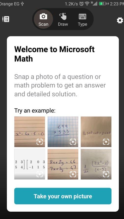 وفي حالة إن كنت ستقوم بتصوير المسألة الرياضية التي تواجهك فقم بالضغط على Take Your Own Picture .