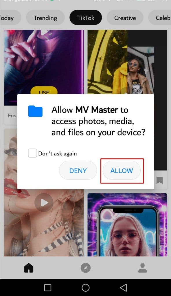 رابعاً : وبمجرد الضغط على USE ستظهر لك لافتة للموافقة على الوصول إلي الصور والفيديوهات والملفات لكي بعمل التطبيق بشكل صحيح فأضغط على ALLOW لاستكمال الاستخدام كما في الصورة التالية :