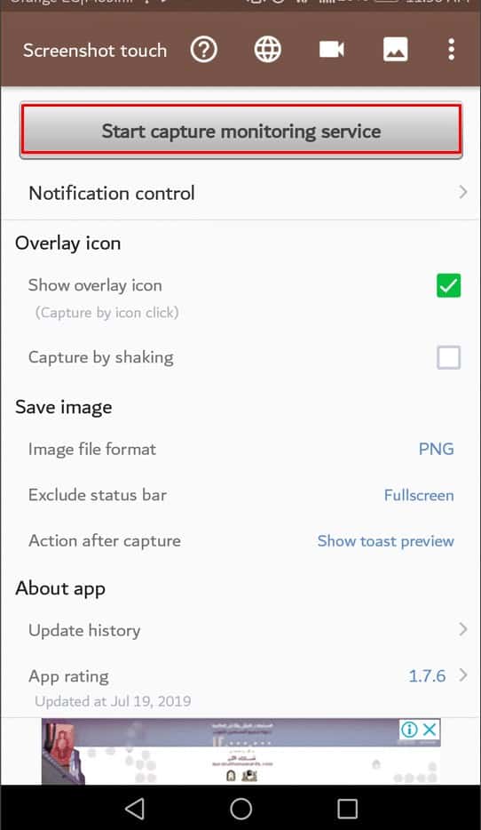 ثالثاً : بعد ذلك سيعرض لنا التطبيق واجهة بها بعد الإعدادات الخاصة بأخذ لقطة للشاشة ولبدء تشغيل خدمات التطبيق أضغط علي Start capture monitoring service كما هو مُشار إليه في الصورة التالية :