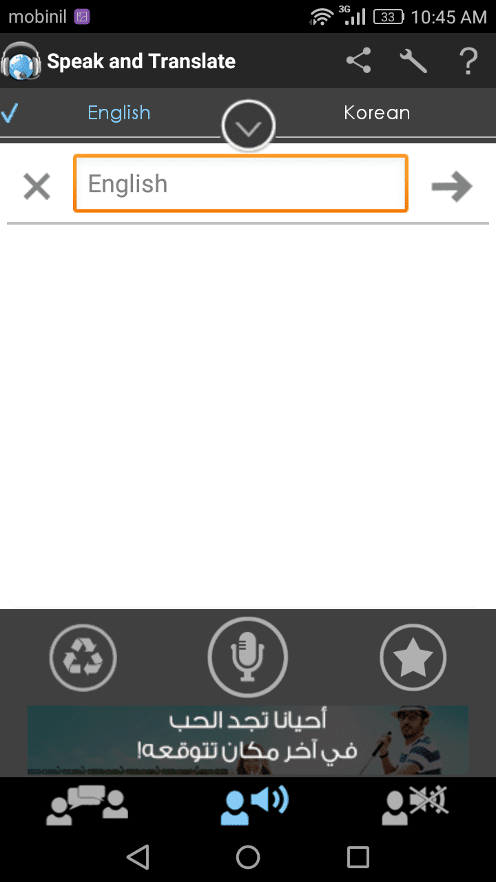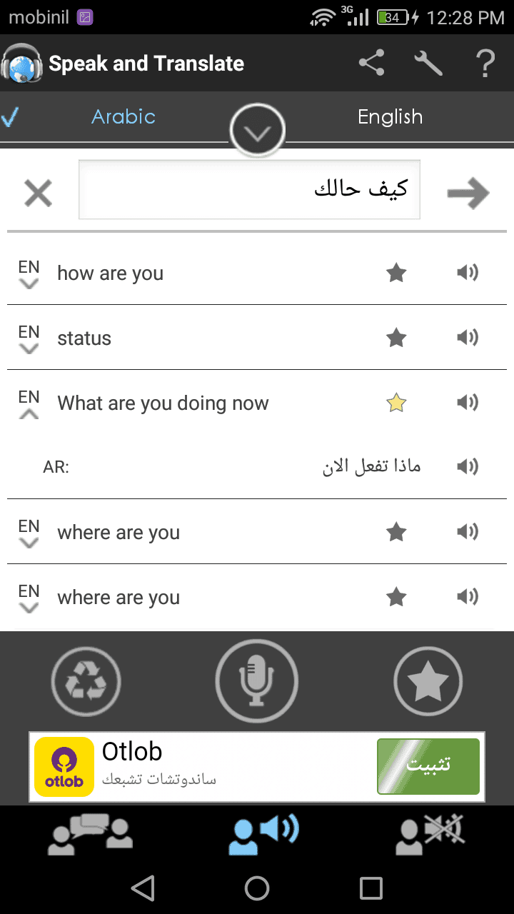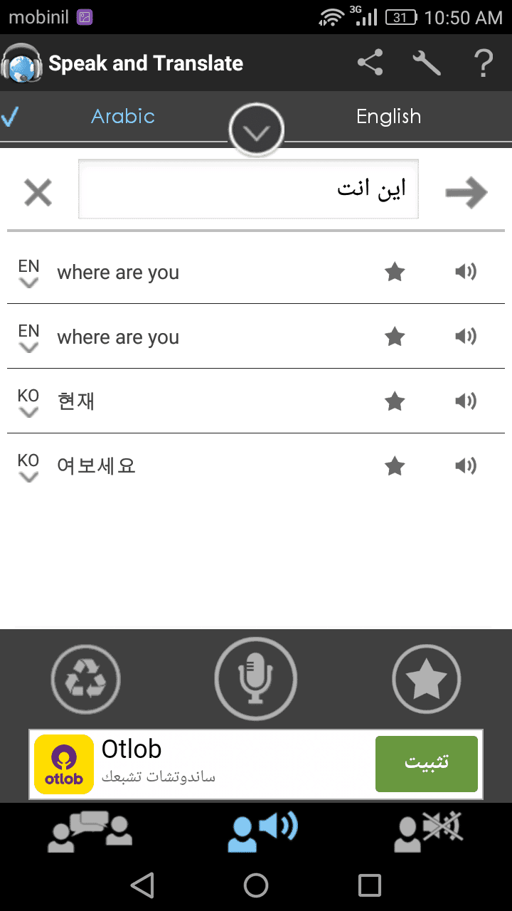 رابعاً : يمكنك الآن البدء في تسجيل أي جملة ولكن بشرط توضيح مخارج الحروف لتتم الترجمة بشكل دقيق ثم الضغط علي السهم الجانبي لتحصل علي نص مكتوب مترجم وأيضاً نطق سليم .