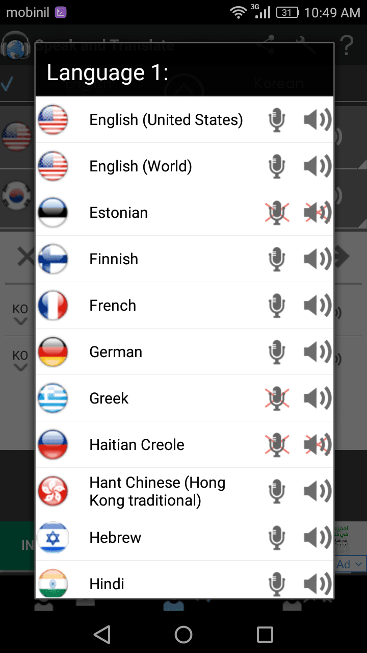 ثالثاً : قم بالضغط علي اللغة الثانية لتختار اللغة التي تريد الترجمة إليها .