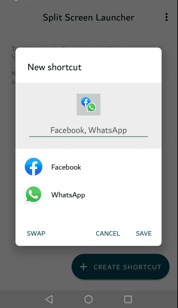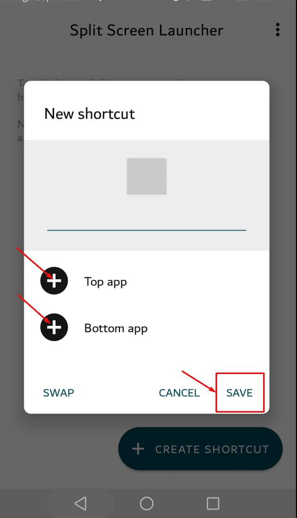 لتشغيل تطبيقين في نفس الوقت علي شاشة واحدة قم بالضغط علي CREATE SHORTCUT :