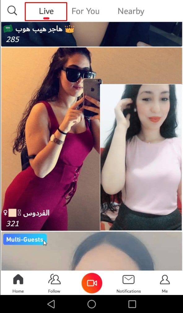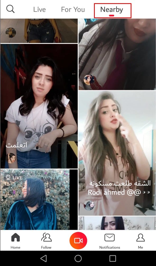 الخطوة الثانية : يمكنك من خلال التواجد علي الواجهة الرئيسية للتطبيق معرفة الأشخاص الذين يقوموا ببث فيديوهات في الحال من خلال الضغط علي Live أو يمكنك معرفة الأشخاص الذين هم بالقرب منك عن طريق الضغط علي Nearby كما هو موجودة في الصور التالية :