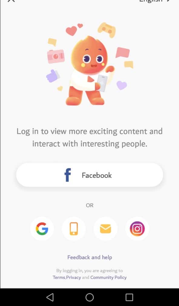 أولاً : بعد أنتهاء عملية التثبيت علي هاتفك قم بفتح التطبيق ستجد واجهة التطبيق كما هي أمامنا في الصورة التالية وبإمكانك أن تبدأ مباشراً بعمل بث مباشر من خلال النقر علي علامة الفيديو لكن يفضل أن تقوم بعمل حساب شخصي باسمك علي التطبيق ولعمل حساب شخصي أضغط علي ” Register / Log in ” :