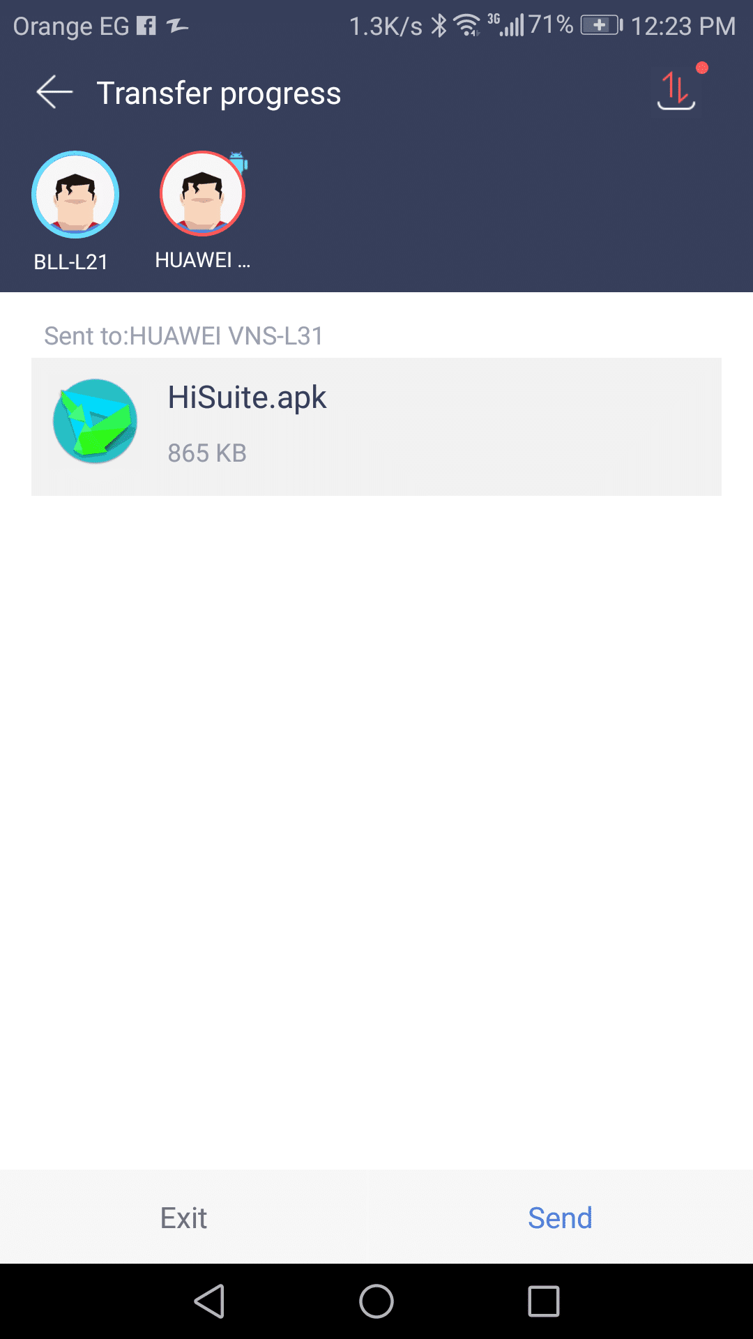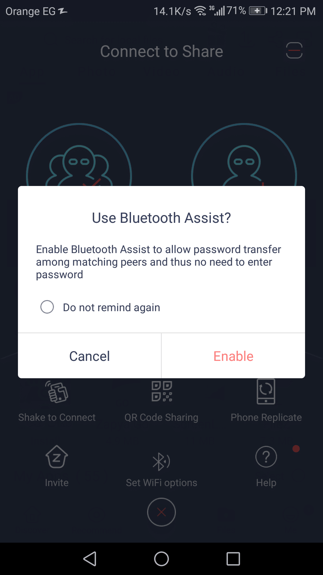 والآن قم بالضغط زر مشاركة الملفات الموجود في منتصف الشاشة وسيبدأ التطبيق في سؤالك إذا كنت تريد أن يتم استخدام البلوتوث كمساعد في عمليات النقل أم لا .