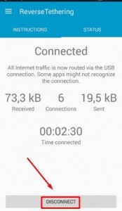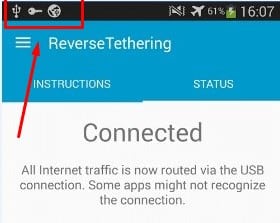 وبعد ذلك كل ما عليك هو الضغط على Connect الموجودة بالتبويب الثاني للتطبيق ثم سيتم اتصال هاتفك بالإنترنت من خلال الكمبيوتر وستظهر علامة المفتاح اعلي هاتفك كما تري :