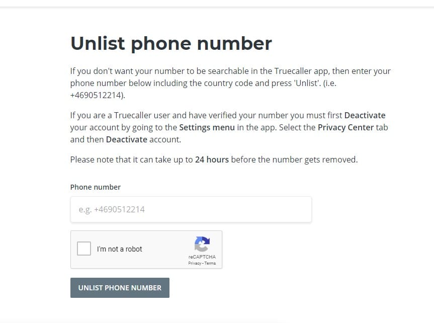 قم بالدخول إلي الموقع الرسمي لتطبيق تروكولر من الرابط الموجود في الأسفل بعد ذلك قم بإدخال رقمك في المكان المحدد كما هو بتلك الصورة ثم قم بتأكيد بأنك لست روبوت من أجل الاستمرار في عملية مسح الرقم وعلى الفور وفي خلال 24 ساعة سيتم مسح رقمك من قاعدة بيانات التطبيق دون أي مشاكل .