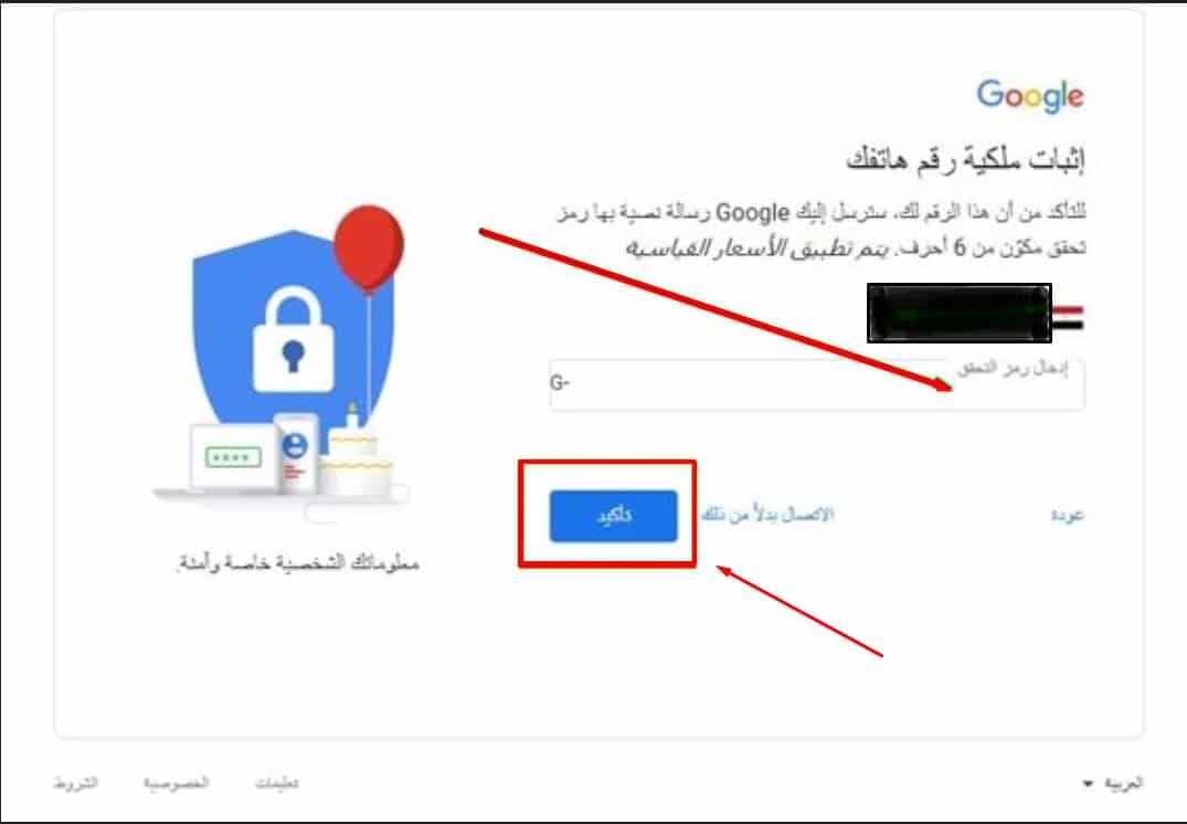 6- سترسل إليك Google رسالة نصية بها رمز تحقق مكوّن من 6 أحرف لتتطابق البيانات كمثل هذا الشكل (G-123456) وستظهر أمامك خانة جديدة في صفحة التسجيل فقم بإدخال الكود في هذه الخانة وأضغط على تأكيد .