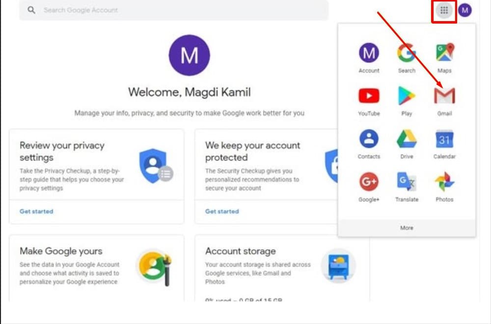 بعد الضغط على أوافق ستذهب إلي صفحة حساب جوجل وللوصول إلي حساب جيميل أضغط على أيقونة التطبيقات والخدمات الموجودة أعلي الصفحة بجانب اسم المستخدم كما في الصورة التالية :