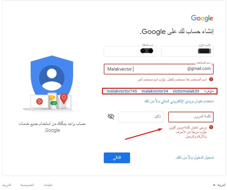 إذا كانت البيانات لا توجد بها أي مشكلة ستنتقل إلي الصفحة التالية وإذا كانت هناك مشكلة فستجد البيانات التي بها مشكلة عليها أشارة حمراء فعلى سبيل المثال إذا كان الاسم المستخدم متشابه مع أسماء أخري فيجب عليك أن تقوم بتغييره حتي لا يحدث خلط بين الأسماء وربما تحدث مشكلة وأيضاً ستجد جوجل يقترح عليك أسماء لا يوجد بها أي مشاكل ومن الأفضل أن تختار منهم أو ربما تجد مشكلة في كلمة المرور فعلي سبيل المثال قد تكون غير قوية ولهذا سيطلب منك جوجل إعادة تعيين كلمة مرور قوية أفضل من كلمة المرور التي قمت بكتابتها فقم بإعادة كتابة البيانات ثم أضغط مرة أخري على التالي .