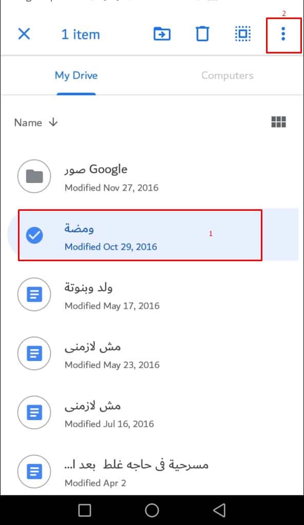 الخطوة الخامسة : أذهب إلي الملقات التي تريد أن تستخدمها في أي دون استخدام إنترنت وأنقر على الملف مطولاً ثم أضغط على علامة الثلاث نقاط التي ظهرت بعد الضغط مطولاً على الملف كما في الصورة التالية :