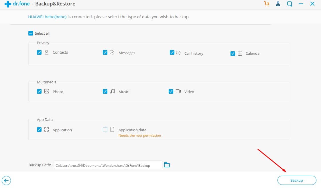 بعد ذلك قم بتحديد البيانات التي تريد عمل نسخ احتياطي لها ثم قم بالضغط على Backup .