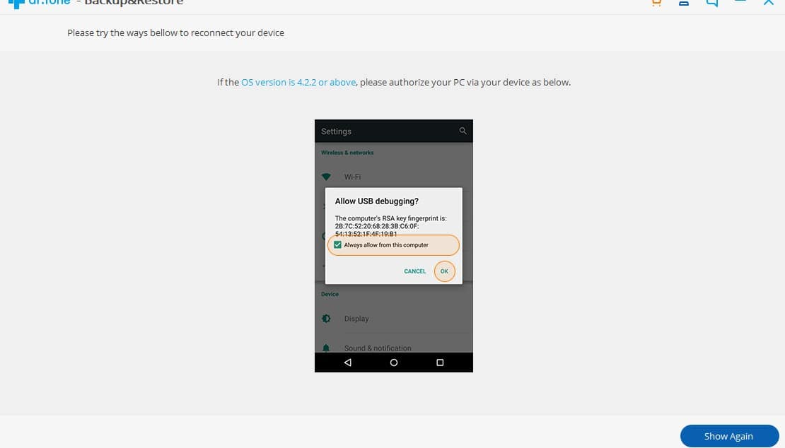 في تلك اللحظة ستقوم بتوصيل هاتفك الاندرويد بالحاسوب ولا تنسي تفعيل usb debugging حتى تتمكن من عمل النسخ الاحتياطي بعد ذلك ستظهر لك تلك الرسالة على شاشة الهاتف وقم بالموافقة عليها .