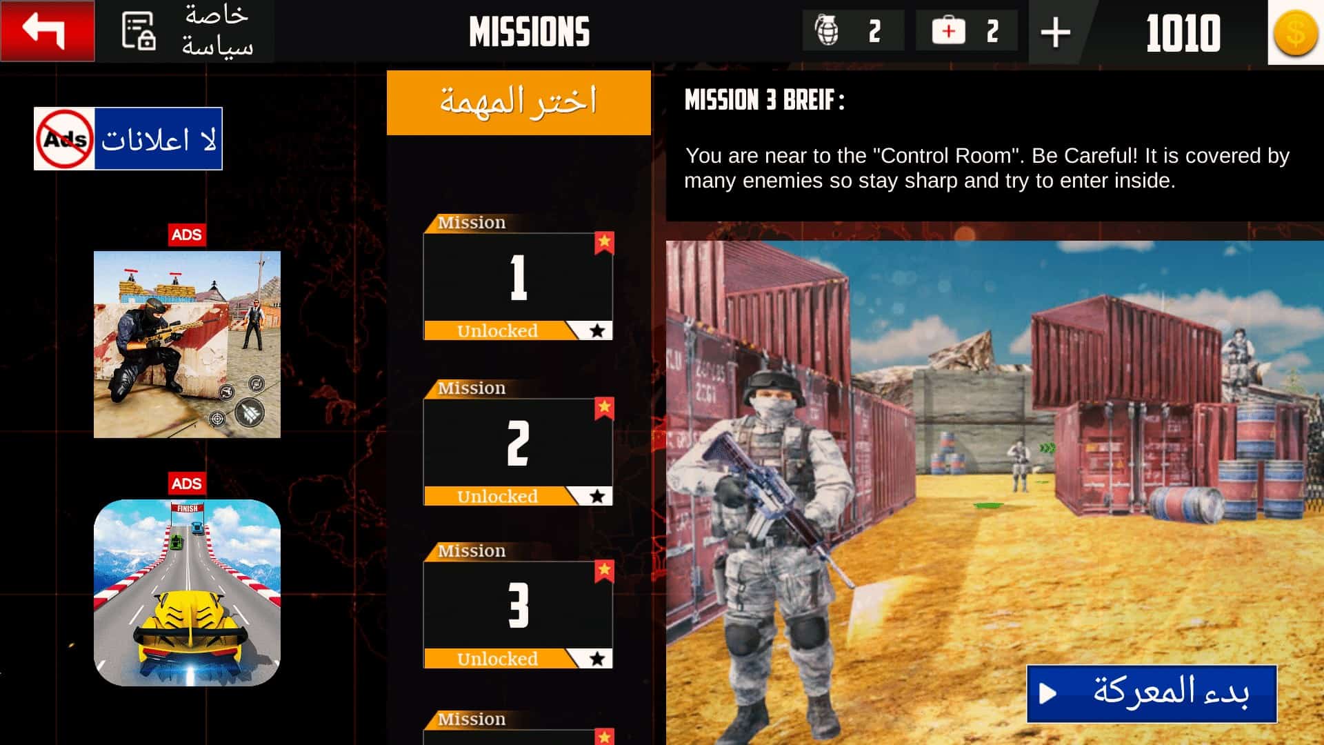 ثالثاً : يمكنك أختيار المهمة التي نود أن تخوضها وتحارب بها ثم النقر علي ايقونة “بدء المعركة” كما هو موجود في الصورة :